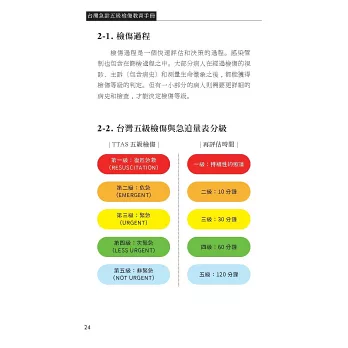 雖然現行的急診五級檢傷制度,已經比過去四級檢傷的做法,有更好的一致性和鑑別急重症的能力,但臨床狀況的變化多,而且檢傷對於急診新進醫師或護理師,常常是一個重大的挑戰,因此需要透過此操作手冊,了解檢傷制度的精神和思考邏輯,才能對於多變的急重症, 進行適當的分類與處置。