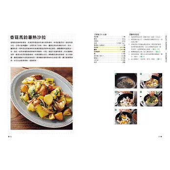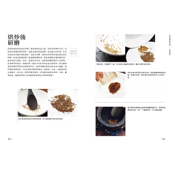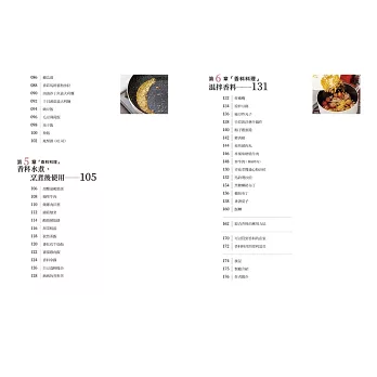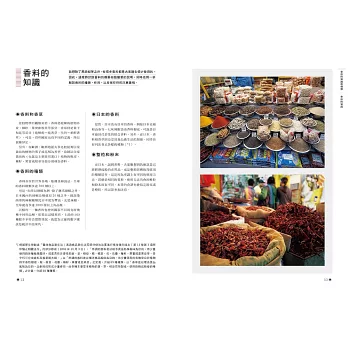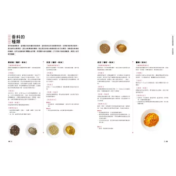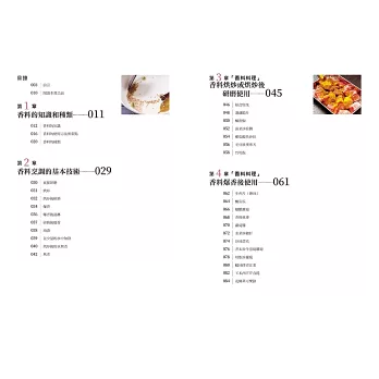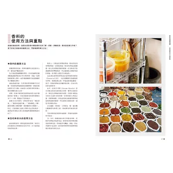 本書有許多使用簡單香料,帶有清淡香氣的料理。首先,先從用量的控制開始吧!等逐漸習慣香料,希望運用更多的時候,請再增加用量或種類。只要稍微控制香料的用量,就算把多種香料料理拼湊成套餐,也不會讓人覺得太膩。另外,在平日的套餐中加入一道香料料理,也能讓整體的味道更加均衡。