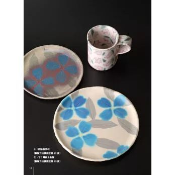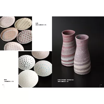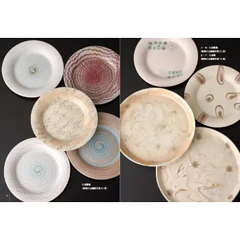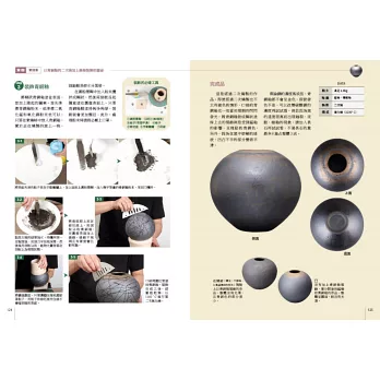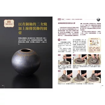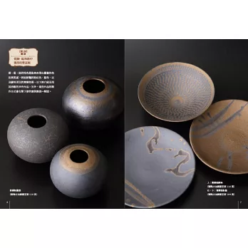 全彩圖解:大量彩色照片呈現鑲嵌鉻銅色土盤、絞胎鉻銅色土杯、發泡花器、錳墨流盤、鉻銅泥釉盤、銅化妝土+錳釉盤、飛鉋銅化妝土+錳釉缽、青銅釉裝飾壺的詳細製作步驟、重點提示眉角要訣,展示完成品的側面、上面、底面、局部圖等,說明特色、原料比例、燒成條件。