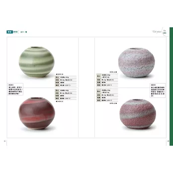大圖展示60件燒成樣本:完整收錄絞胎揉入銅、錳、鉻、碳化矽,淋上錫白釉、白雲石釉、鹼性釉、鋇釉、透明釉,以氧化燒成和還原燒成的圓壺樣本,精采呈現螺旋圖案燒成氛圍、質感、顏色,詳細刊載原料比例、燒成觀察紀錄。
