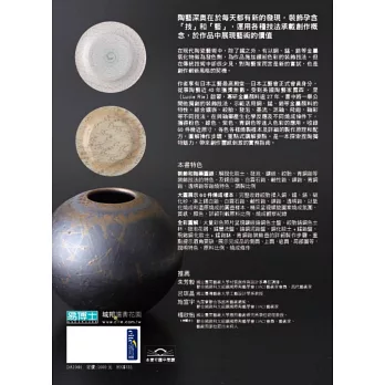 作者享有日本工藝最高殿堂─日本工藝會正式會員身分,從事陶藝近40年獲獎無數。受到英國陶藝家露西‧里(Lucie Rie)啟蒙,專研金屬顏料逾27年。書中將一舉公開他獨創的裝飾技法,示範活用銅、錳、鉻等金屬顏料的特性,結合鑲嵌、絞胎、發泡、墨流、泥釉、飛鉋、釉彩等不同技法,在與釉藥化學反應及不同燒成條件下,獲得粉色、綠色、紫色、青銅色等迷人色彩的應用。收錄60件幾近原寸、各色各樣燒製樣本及詳細的製作原理和配方,圖解操作步驟,重點式講解要點。是一本探索捏陶獨特魅力,帶來創作靈感刺激的實務指南。