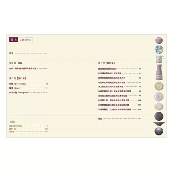 裝飾和釉藥圖錄:解說化妝、發泡、鑲嵌、絞胎、青銅釉等裝飾技法的特色,及錫白釉、白雲石釉、鹼性釉、鋇釉、青銅釉、透明釉等釉燒特色、調製比例。