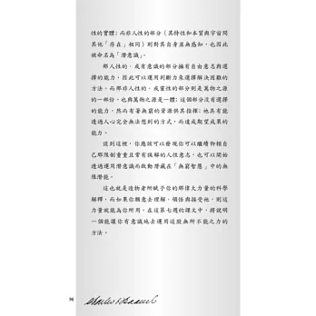 本書傳授心靈力量的運用之道──是真正的心靈力量,而不是其他替代物與扭曲誤解後的產物;當中教授的內容與催眠、魔術或任何看似炫目,實際上只是障眼法,會誤導人以為有東西真的能憑空出現的東西截然不同。本書能培養與發展你的理解認知,讓你能掌控自己的身體,進而改善健康、能提升與強化記憶力;它也能強化你的洞察力,那種在每個成功的商業人士身上都會看到的,極為罕見的洞察力、那種能讓人看清在每一個狀況下的困難與可能性的洞察力、那種能讓人看清近在眼前的機會的洞察力──因為總有許多人對於伸手可及的機會視而不見,卻又汲汲營營於那種根本不可能帶來實質回報的東西。