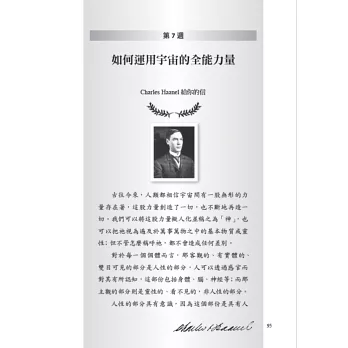 本書開發出的心靈力量會讓其他人直覺地知道你是充滿力量又有品格的人,而他們將因而想要去做你要他們做的事;這也表示你會把人們與各種事物吸引過來、你會成為有些人會說「運氣很好,好事總是發生在他身上」的人。你也會理解大自然的基本法則,並讓自己與這些法則協調一致;你會與「無限」同頻共振、你會了解「吸引力法則」、自然界的成長法則,以及能讓你在社會上與商業世界中佔盡優勢的各種心理法則。
