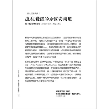 這本書的內容,是帕秋仁波切數年之間於全球各地的傳法開示。我記得一群親近的學生聚集在尼泊爾博達大佛塔區,大家坐在仁波切起居室的地板上,在擺滿仁波切先輩傳下珍貴佛像的木製佛龕前喝茶,全神貫注地聆聽仁波切陳述慈悲的本質。盛夏時節的紐約庫柏斯敦(Cooperstown),在仁波切的閉關中心裡,仁波切用《三摩地王經》的根本頌,生動地向弟子們開示禪定的真義;秋天的紐約中央公園旁一間舒適的公寓裡,仁波切則描述了對於一個沒有痛苦的心靈來說,事物是如何顯現的。在以上每一個時空中,仁波切都依據釋迦牟尼佛的教誨,帶領我們直趣佛陀智慧的核心。