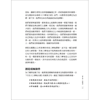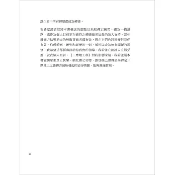 這是一本寫給初學者的書,同時也為了那些以佛法為生命核心的人而寫。本書非常適合從頭到尾全文閱讀,或者可以依序花一週、兩週、一個月或一年的時間完成每章末所附的練習。另外一種讀法是隨時打開任何章節,並從其中文字收集靈感,這種方法也能有所幫助。