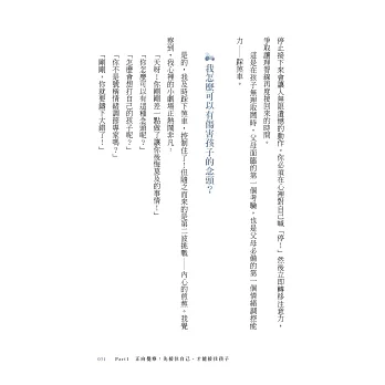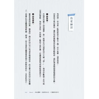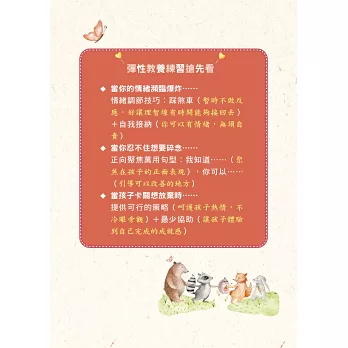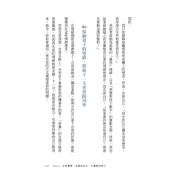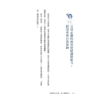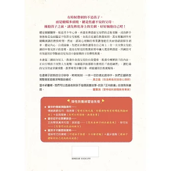 本書從三個面向切入:教養中身為父母的自我覺察、教養中理解孩子的內在、正向引導孩子面對人生挑戰。每個篇章後都附有實用的「為愛練習」,讓忙碌的父母快速掌握重點,跟著專業步驟引導,輕鬆運用於教養現場。