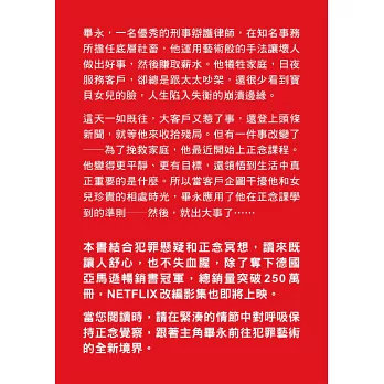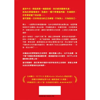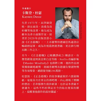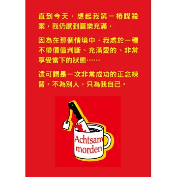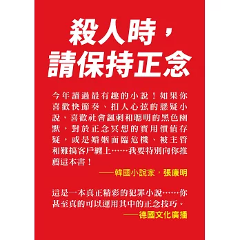 正念冥想已成為近年來心靈成長的主流風潮,但你絕對想不到,它居然也能成為謀殺的操作守則?這是一本充滿高度懸念,題材新穎的懸疑小說,但在主角焦慮的內心戲與緊張的情節推進中,很難不讓人在充滿高度荒謬氛圍裡笑出聲,恰到好處的黑色幽默,精準而犀利地串連起整個故事;充滿節奏感的敘事,讓閱讀的時光快速流逝,無論你是懸疑小說的重度讀者,或是正念覺察的使用者,歡迎一起進入這個明快而令人印象深刻的荒誕世界。