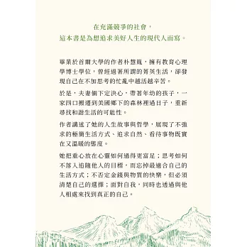 畢業於首爾大學的作者朴慧胤,擁有教育心理學博士學位,曾經過著所謂的菁英生活,卻發現自己在不加思考的忙亂中越活越辛苦,精疲力竭的丈夫也突然宣布要辭職。於是,夫妻倆下定決心,帶著年幼的孩子,一家四口搬遷到美國鄉下的森林裡過日子,重新尋找和諧生活的可能性。