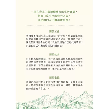 作者講述了她的人生故事與哲學,展現了不強求的極簡生活方式、追求自然、看待事物既實在又溫暖的態度。她把重心放在心靈如何過得更富足;思考如何不落入追隨他人的目標,而忘掉最適合自己的生活方式;不否定金錢與物質的快樂,但必須清楚自己的選擇;面對自我,同時也透過與他人相處來找到真正的自己。