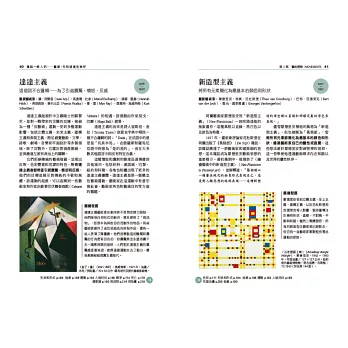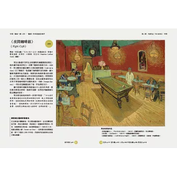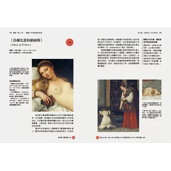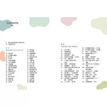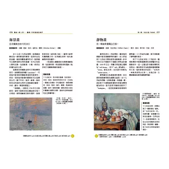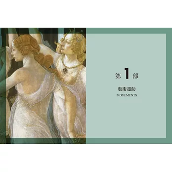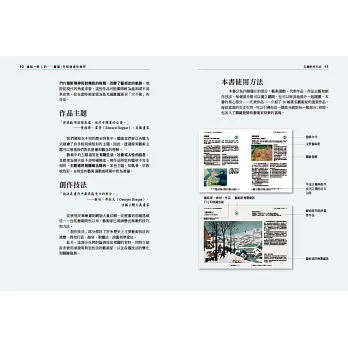 這本書分為四個獨立的部分:藝術運動、代表作品、作品主題和創作技法。每個部分都可以獨立閱讀,也可以與其他部分一起閱讀。本書的核心部分——代表作品——介紹了 50 幅著名藝術家的重要作品。每頁底部的交叉引用,可以引導你從一個部分到另一個部分,同時特色方框討論了關鍵發展和每位藝術家的背景。