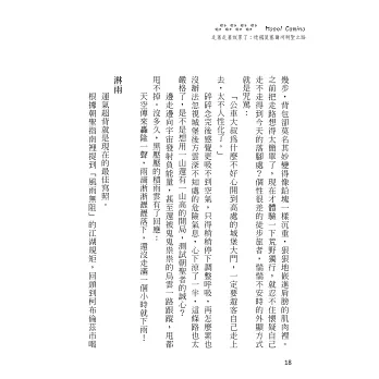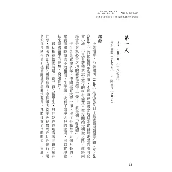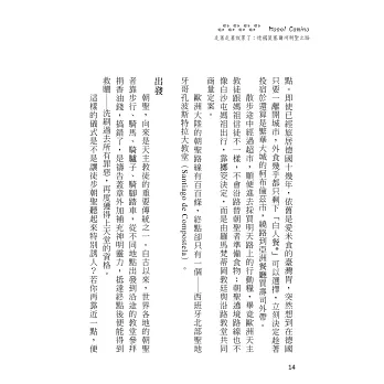 她用自然又深刻的筆觸,記錄了自己在工作生活中種種疲憊掙扎及徒步中的心靈歷程:「甩掉了四壁之間令人氣悶的安全感,終結了一成不變的日常的磨損,遠離選擇多到不勝枚舉的現代社會,才赫然明白,朝聖走到今天,如同一場迷你的心靈出走之旅。」從一開始的筋疲力盡、身心煎熬,到逐步覺察自己的意識及人生的意義。這不僅僅是一趟身體上的旅行,更是一次心靈的探索和自我發現。