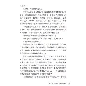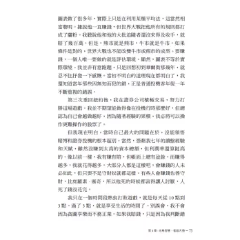 翻譯錯誤或語焉不詳,你就不知道它在說什麼,就會剝奪人們從經典中獲得真知灼見的機會。李佛摩是一個智者,現在你和他擦肩而過,和智者擦肩而過就必須得有所收穫才好,不然就像賣掉一支股票卻眼睜睜地看著它暴漲了幾百元一樣,會讓人後悔,想補倉又不敢。而這個版本和好股票又不同,不會瞬息萬變,它很有耐心,一直會等你回來,再慢條斯理地跟你講完一個半世紀的交易經歷,半個世紀的起起伏伏,一個從5塊錢本金到月入1億的故事和智慧。