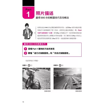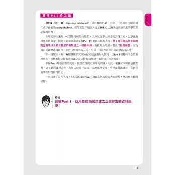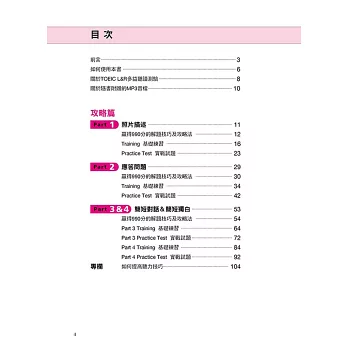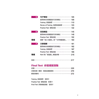 從「贏得990分的解題技巧及攻略法」和「Training基礎練習」兩部分學到的,就用寫實戰試題來確認!每單元的「Practice Test實戰試題」要你將前面學到的解題技巧,實際運用在考題上,累積手感!