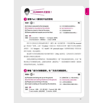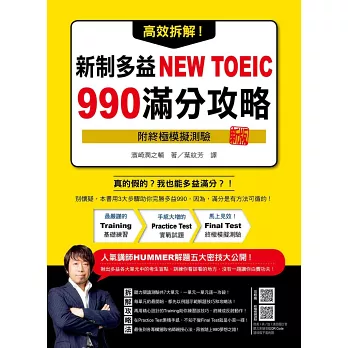 面對多益的第一步,就是確認各單元中「贏得990分的解題技巧及攻略法」。但是掌握技巧就像學騎腳踏車,就算人家跟你講一百遍還是很抽象,所以本書每單元都從「例題」開始,讓自己先試個兩題,寫完「例題」後,再閱讀「HUMMER式密技」,HUMMER老師馬上以該例題示範最有效的解題步驟,也就是用實際的例子帶你看該看的地方!例如:考試時,應如何分配時間先預覽紙上試題,將看似只能被動挨打的聽力測驗,巧妙化為主動攻擊!