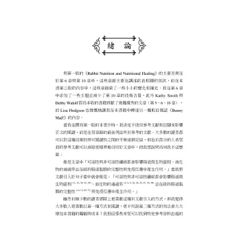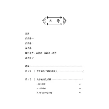 最後讓我像第二版一樣地結束序言:「我既不期望也不希望每個讀者都能同意我這本書中所有的觀點,但我希望可以引起有思維的讀者考慮到在兔子營養與健康中沒有唯一的正確答案,每隻兔子都是獨一無二的個體,並不是所有的指南都能『套用』之。」