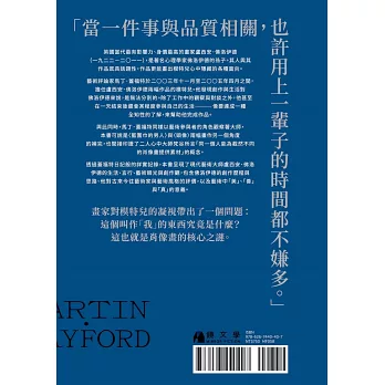 與此同時,馬丁.蓋福特同樣以藝術參與者的角色觀察著大師,本書可說是《藍圍巾的男人》與《頭像》兩幅畫作另一個角度的補完,也間接印證了二人心中大師梵谷所言「同一個人能為截然不同的肖像畫提供素材」的概念。
