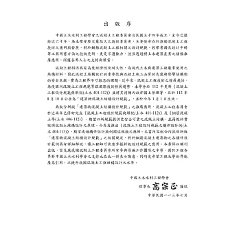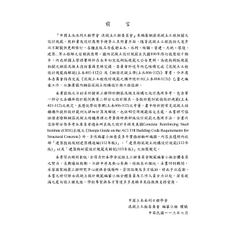 為配合新版「建築物混凝土結構設計規範」之推廣應用,中國土木水利工程學會所設之「混凝土工程委員會」於近兩年相繼已修訂完成《混凝土工程設計規範與解說(土木401-112)》及《鋼筋混凝土學(土木406-112)》,期望以新規範提供更安全可靠之混凝土結構,並藉教科書說明混凝土結構設計之原理。