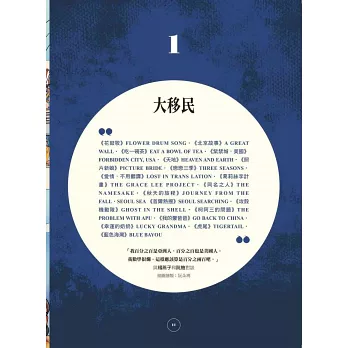 這本集錦涵蓋了130多部電影,時間跨度超過100年——從1915年西席地密爾(Cecil B. DeMille)的《矇騙》(The Cheat),到李安(Ang Lee)的《囍宴》(The Wedding Banquet)、王穎(Wayne Wang)的《喜福會》(The Joy Luck Club),再到2022年丹尼爾雙人組(Daniel Kwan、Daniel Scheinert)橫掃奧斯卡的《媽的多重宇宙》(Everything Everywhere All at Once)。透過亞裔插畫家精美的作品,還有好萊塢各地編劇、演員、製片人和導演的個人軼事,這部開創性的書籍探討了這些標誌性的電影如何塑造了美國對亞洲人的觀感,以及亞裔美國人如何看待自己。