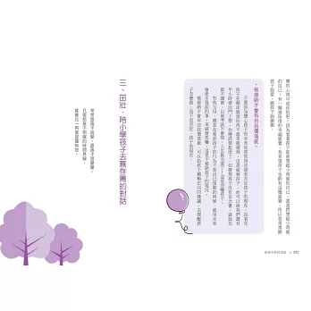 數到三,是親子間經常出現的話,有效嗎?但卻是孩子的惡夢!用言語威脅孩子不但收不到效果,反而會失去父母的威信。和孩子談說話的藝術,該如何教孩子選擇好好說話。陪孩子在對話中排定他要做事情的輕重緩急,每天做、每天練習,就能養成對時間與處理事情的敏感度,孩子也能在他律中養成自律的能力。