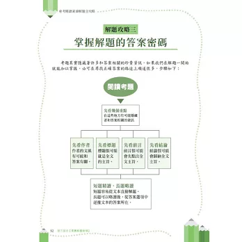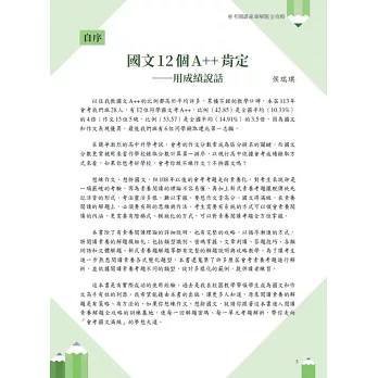 這本書是有實際成功的使用經驗,過去是我在校園教學帶領學生成為國文和作文高手有效的利器。我希望能藉由本書的出版,讓更多人知道,原來閱讀素養的解題是有策略、有方法的。如果你想練作文、想拚國文,就請你跟著這本書進入閱讀素養解題全攻略的訓練基地,使每一回解題密碼、每一單元考題解析,帶你走向「會考國文滿級」的夢想大道。