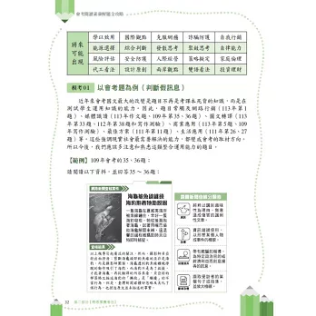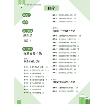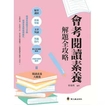 本書除了有素養閱讀理論的詳細說明,也有完整的攻略,以循序漸進的方式,將閱讀素養的解題模組化:包括類型識別、密碼掌握、文章判讀、答題技巧、各類詞語和文體解題、新式素養題解題等都有完整的解題說明與攻略教學。為了讓考生進一步熟悉閱讀素養各式變化題型,本書還蒐集了許多歷屆會考素養考題進行解析,並依據閱讀素養考題不同的類型,設計多樣化的範例,提供讀者練習。