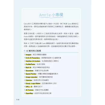 特別邀請 Canva 官方宣傳大使 Annie 參與協作,在各章節結尾提供專業補充,並獨家分享她的 Canva 技巧與靈感。