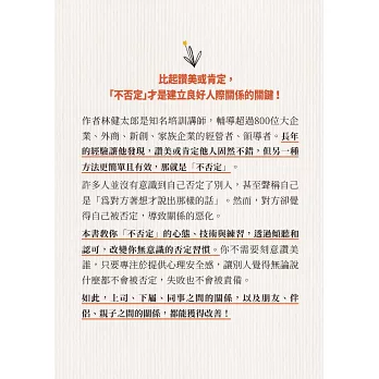 作者林健太郎是知名培訓講師,輔導超過800位大企業、外商、新創、家族企業的經營者、領導者。長年的經驗讓他發現,讚美或肯定他人固然不錯,但另一種方法更簡單且有效,那就是「不否定」。