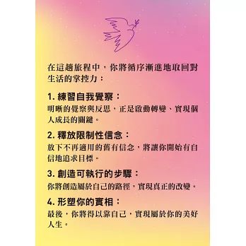 在這趟旅程中,你將循序漸進地取回對生活的掌控力: