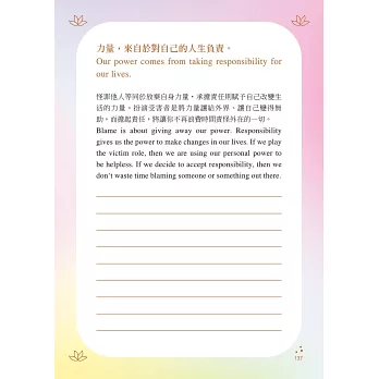 ‧藉由負起責任,我們將開啟改變的力量。請問問自己:「在這種情況下,我能做些什麼?」我們必須明白,我們一直擁有足夠的力量,可以隨時選擇以不同的方式做出回應。
