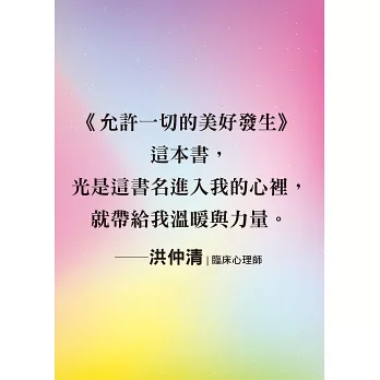 每當我閱讀書裡的某句話語,就會去覺察內在智慧的回應。那回應,可能是某種感受,又或者是某種評論。可能是相信,也可能是抗拒。我跟每個句子,產生了深淺不一的關係,並建構出更完整的自我。《允許一切的美好發生》這本書,光是這書名進入我的心裡,就帶給我溫暖與力量。想跟讀者分享這本書,藉著這本書所傳遞的美好訊息,能跟我們自己好好說說話。—— 洪仲清 | 臨床心理師