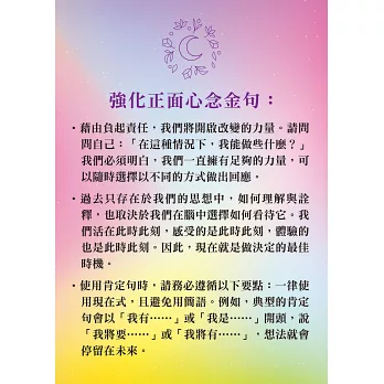 ‧使用肯定句時,請務必遵循以下要點:一律使用現在式,且避免用簡語。例如,典型的肯定句會以「我有……」或「我是……」開頭,說「我將要……」或「我將有……」,想法就會停留在未來。