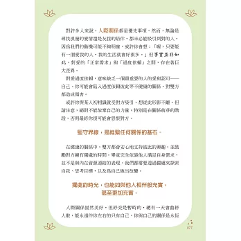 ‧人際關係固然美好,但終究是暫時的,總有一天會曲終人散,能永遠伴你左右的只有自己。你與自己的關係是永恆的,因此請務必成為自己的知己。