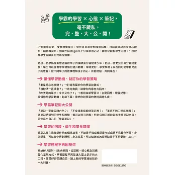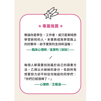 每個人都需要找到屬於自己的讀書方法,乙烯以大姊姊的身分,告訴所有想要努力卻不知從何做起的同學們:「你們已經很棒了。」 學習本來應該就是有趣的事情,現實的各種壓力卻奪走了我們原有的那份快樂,但我們都可以找回起初的那份動力,你不用贏過任何人,只需要超越昨天的自己,乙烯不只是學霸,更是一個努力且有禮貌的好榜樣。 ——心理師/王雅涵
