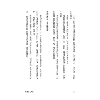 對於《源氏物語》中愛情的浪漫與現實、女性角色的地位和命運、宗教信仰與思想如何影響了紫式部的創作、和歌為什麼成為傳遞情感的重要元素,以及朦朧描寫和文章節奏美感如何影響後世文學創作等,作者均有精闢的思索和研究,提供讀者從中一窺經典文學的堂奧,是理解《源氏物語》無窮魅力的必讀之作。