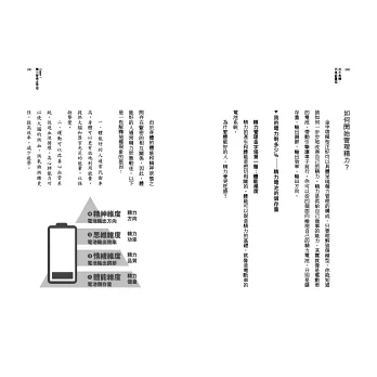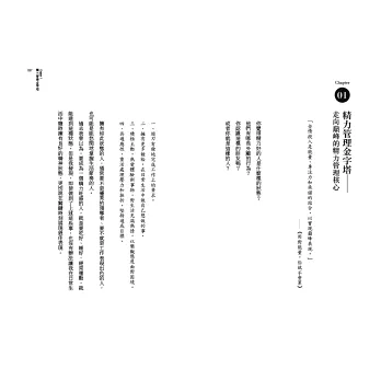 透過本書中的精力管理心法,你將能在短時間內產出高品質的工作成果;擁有更多餘裕,只做自己想做的事;遊刃有餘地處理壓力和挫折,在關鍵時刻展現最佳表現。