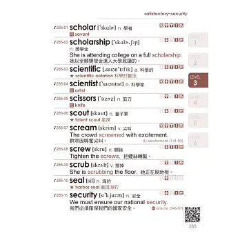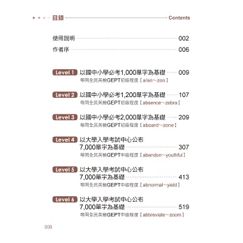 全書單字符合大考中心公布的《108課綱高中英文參考詞彙表》,依照程度分成6個LEVEL,便於學習者由淺入深、依序學習,英語能力無痛升級。而每個單字皆有標示適用範圍的考試燈號,不管是要準備全民英檢、多益、托福或雅思,學習者都能夠依照需求有效學習。