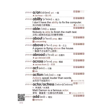 除了用眼睛背單字之外,用耳朵記憶、熟悉發音更是背好單字的訣竅。書中提供單字、例句與補充內容的音檔,只要搭配隨書附贈的Youtor App(內含VRP虛擬點讀筆),掃描書中QR Code下載音檔,只要下載完成後,就可以隨掃隨聽,離線也能聽,再也不用費心尋找CD播放器了。