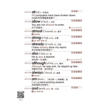 每個單字皆有標示KK音標、詞性、中文字義,先學會發音再記單字。每個單字再擇一補充同義字、反義字、片語或例句,不僅背單字,還會靈活運用。