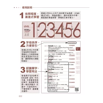 利用「散步學習法」,無論你身在何處都能「隨手背單字」。全書單字依照大考中心《108課綱高中英文參考詞彙表》分為6個LEVEL,完全適用於大學學科能力測驗與分科測驗,並適用於國中會考、全民英檢初級與中級、多益TOEIC、雅思IELTS、托福TOEFL等國內外英文檢定。