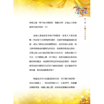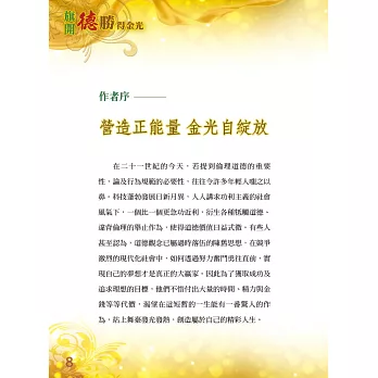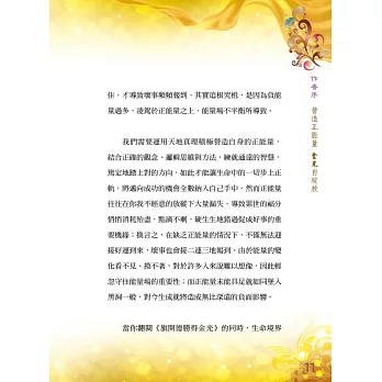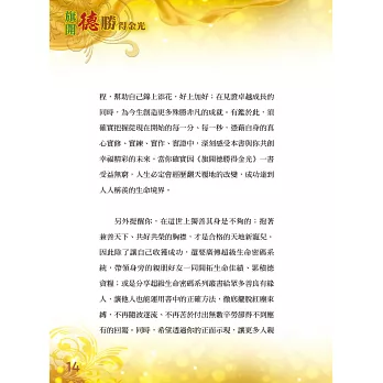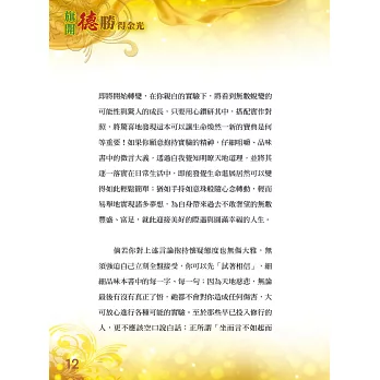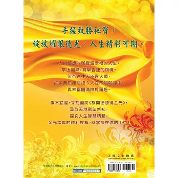 當你翻閱《旗開德勝得金光》的同時,生命境界即將開始轉變,在你親自的實驗下,將看到無數蛻變的可能性與驚人的成長,只要用心鑽研其中,搭配實作對照,將驚喜地發現這本可以讓生命煥然一新的寶典是何等重要!如果你願意抱持實驗的精神,仔細咀嚼、品味書中的微言大義,透過自我覺知明瞭天地道理,並將其逐一落實在日常生活中,即能發覺生命進展居然可以變得如此輕鬆簡單;猶如手持如意珠般隨心念轉動,輕而易舉地實現諸多夢想,為自身帶來過去不敢奢望的無數豐盛、富足,就此迎接美好的際遇與圓滿幸福的人生。