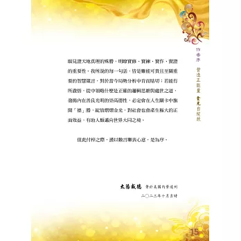 獲致天地法寶的你,就更加不能掉以輕心,應從此書開始,用心研讀太陽盛德所著作的超級生命密碼系列叢書,儘可能地參與天圓文化所開設的各種主題課程,幫助自己錦上添花,好上加好;在見證卓越成長的同時,為今生創造更多殊勝非凡的成就。有鑑於此,須確實把握從現在開始的每一分、每一秒,憑藉自身的真心實修、實練、實作、實證中,深刻感受本書與你共創幸福精彩的未來。當你確實因《旗開德勝得金光》一書受益無窮,人生必定會經歷翻天覆地的改變,成功達到人人稱羨的生命境界。