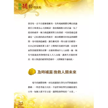 另外提醒你,在這世上獨善其身是不夠的;抱著兼善天下、共好共榮的胸襟,才是合格的天地新寵兒。因此除了讓自己收獲成功,還要廣傳超級生命密碼系統,帶領身旁的親朋好友一同開拓生命佳績、累積德資糧;或是分享超級生命密碼系列叢書給眾多善良有緣人,讓他人也能運用書中的正確方法,徹底擺脫紅塵束縛,不再隨波逐流、不再苦於付出無數辛勞卻得不到應有的回報。同時,希望透過你的正面示現,讓更多人親眼見證天地真理的殊勝,明瞭實修、實練、實作、實證的重要性。我所說的每一句話,皆是難能可貴且至關重要的智慧箴言,對於當今局勢分析中肯而貼切;若能有所澈悟,從中領略什麼是正確的邏輯思維與處世之道, 發揚內在善良光明的崇高德性,必定會在人生關卡中旗開「德」勝,綻放熠熠金光,對社會也會產生極大的正面效益,有助人類邁向世界大同之境。