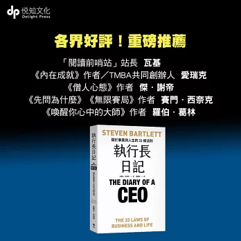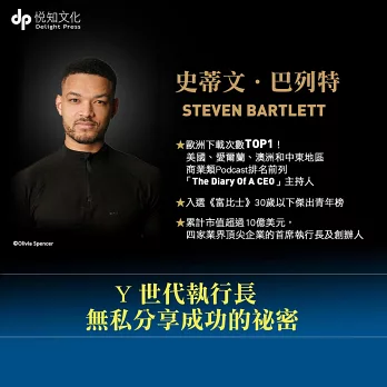 除了豐富的創業、投資與行銷經歷,他還主持廣受英國與歐洲聽眾歡迎的播客節目「The Diary Of A CEO」,並在過去四年,針對全球眾多商業界、體育界、娛樂界和學術界的頂尖人士,進行了超過700小時的訪談。透過親身經歷與深度對話,史蒂文見證了高潮和低谷,分析失敗的時刻和成功的模式,並從中淬鍊出一套能應用於任何行業、可供追求卓越成就的人們參考的33條基本法則。
