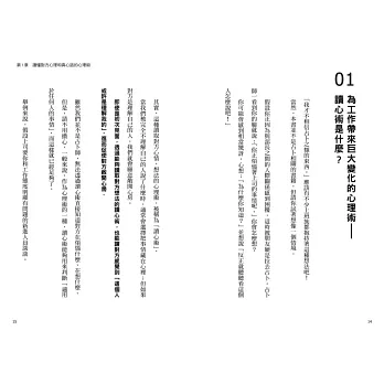 本書以盡可能淺顯易懂的方式整理出,任何人都能夠在職場人際關係、顧客應對、工作、讀書、日常生活中簡單應用的心理術。
