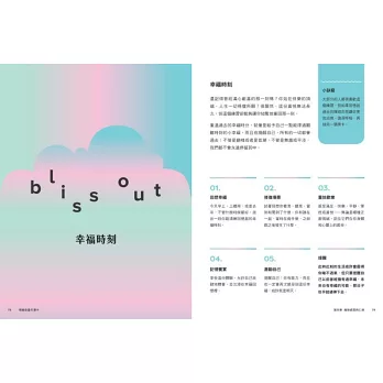 練習的最終目的,是幫助每個身陷情緒低谷的人,慢慢找回心靈的平靜與生活品質,重要的是,這些練習都非常簡單,大多都能夠在不同的場合裡嘗試。而柔和的色調與清楚易讀的設計,不僅適合成人使用,也非常適合孩子練習。