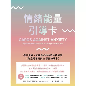 來自英國、擅長處理兒童和青少年心理健康議題的知名心理及精神疾病專家──普琪.奈特史密斯博士,針對現代人在生活中經常面臨的焦慮與壓力問題,以認知行為治療(CBT)理論為基礎,設計出《情緒能量引導卡》指導手冊與隨身牌卡,帶領讀者對抗或預防焦慮等情緒,這些方法包括: