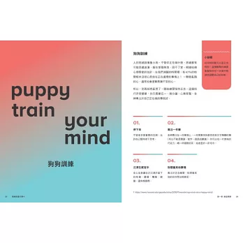 你可以直接跳到目前最需要的技巧,也可以一章一章慢慢探索,此外,而每一章還提供「進階練習」,是效果更為強烈的訓練方式。無論針對某些特定情況的擔憂,或是可能導致身心恐慌的問題,都能夠在手冊裡找到對應的練習。