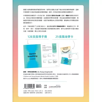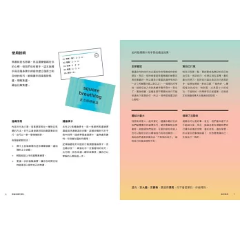 作者設計了25張口袋大小、適合隨身攜帶的情緒急救牌卡,每一張都將對抗焦慮的練習濃縮成快速簡潔的步驟,而更可以在手冊中相應對照。