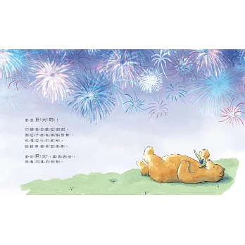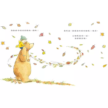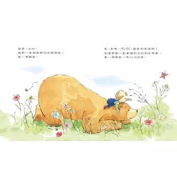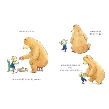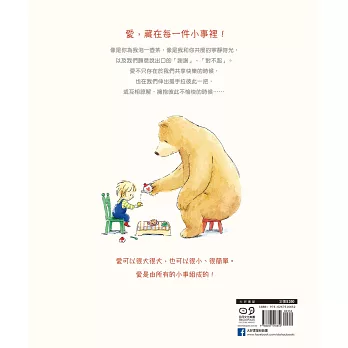 ★以大熊和男孩為主角,廣義探討愛的真諦,讓我們自然帶入父母對孩子的情感,浮現相處的情境。在生活中,親子一起分享「愛」的點點滴滴,聊聊那些深刻的感受……